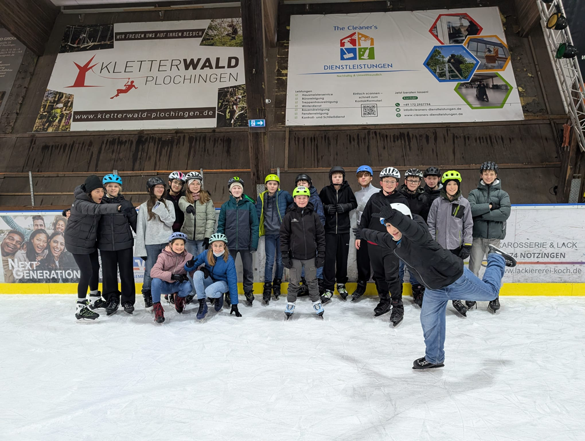 Auch dieses Jahr kam die Sportklasse 7 in den Genuss das Bewegungsfeld Gleiten intensiv zu erleben. Auf dem Eis wurde sich nicht nur fortbewegt, die Schülerinnen und Schüler drehten sich, fuhren Slalom, übten sich im Stoppen und rückwärts fahren und erfanden gar eine komplette Partner- und Gruppenkür. Ein besonders wertvoller Vormittag für alle Beteiligten spürt hoffentlich noch länger nach.